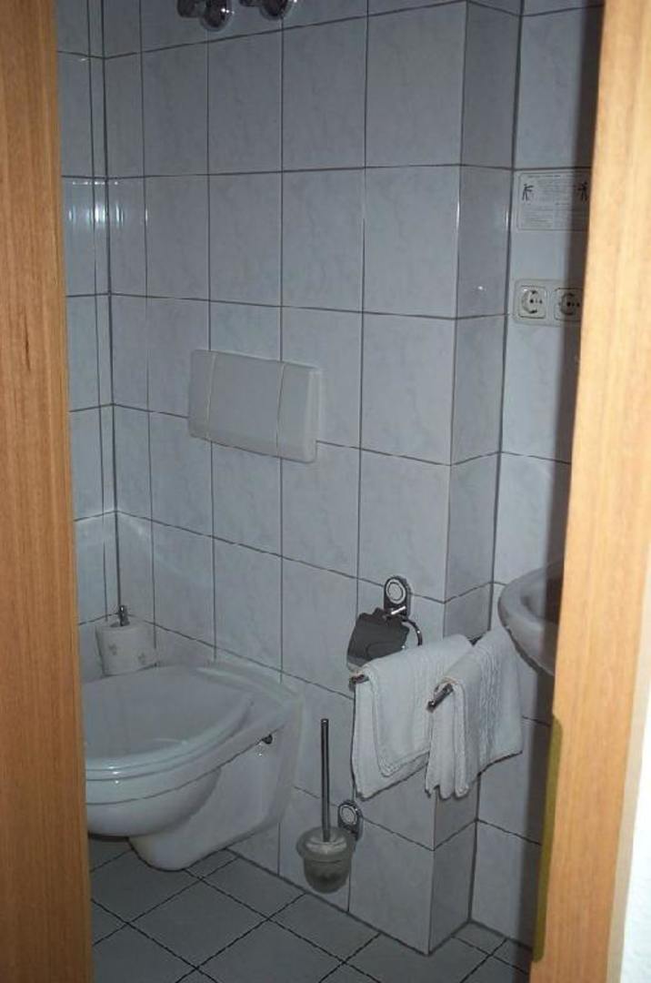 Angenehm sauber - Toilette / BadezimmerPfungstadt-Eschollbrücken, Gasthaus-Hotel " Zum Lamm" . Ist ein bißchen eng aber angenehm sauber.