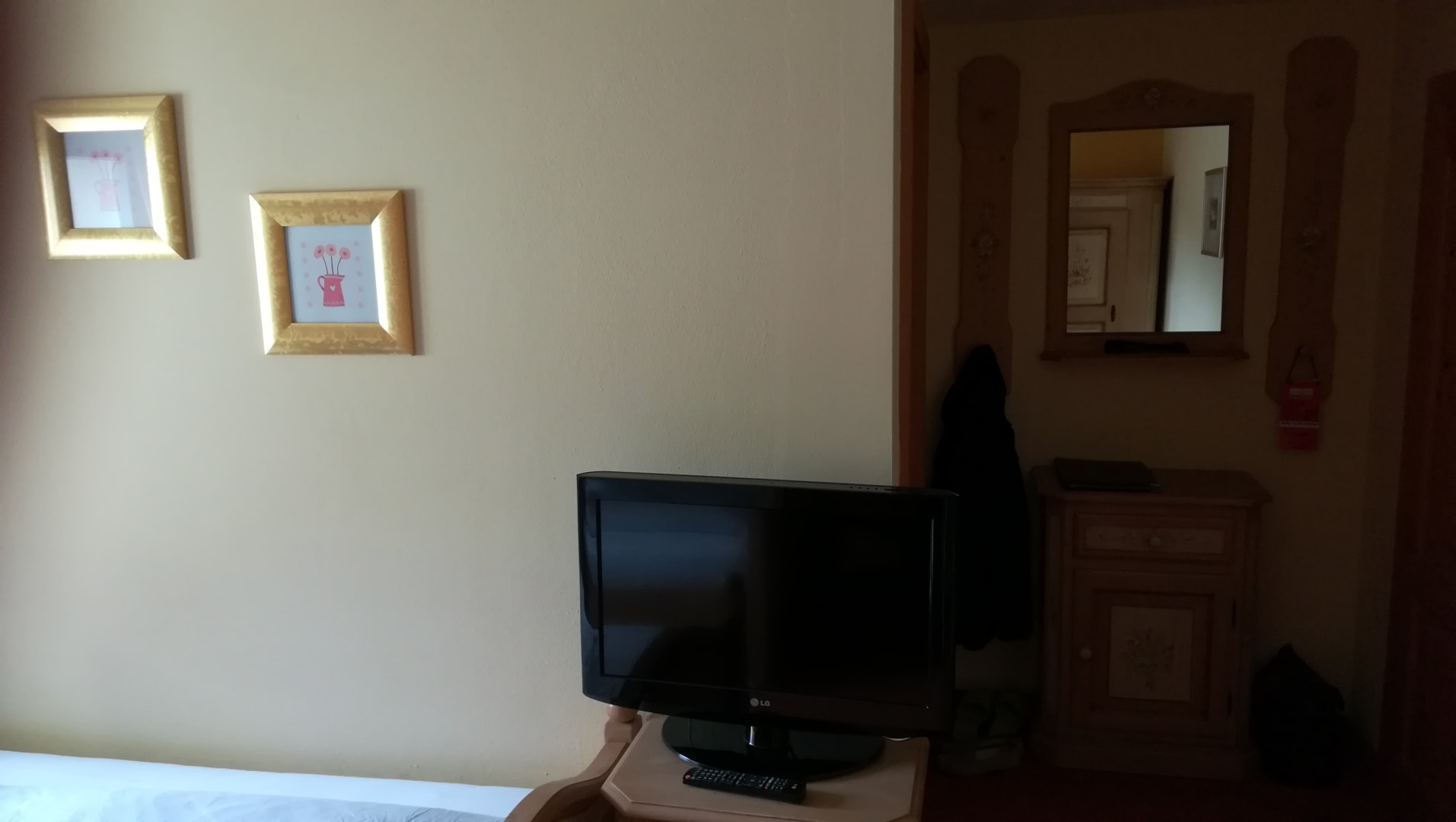 Der schlecht platzierte Fernseher, im Hintergrund die Kleiderhaken !