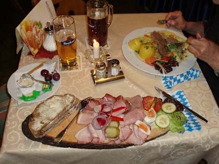 Abendessen im Restaurant. Schinkenplatte und gekochtse Ochsenfleisch