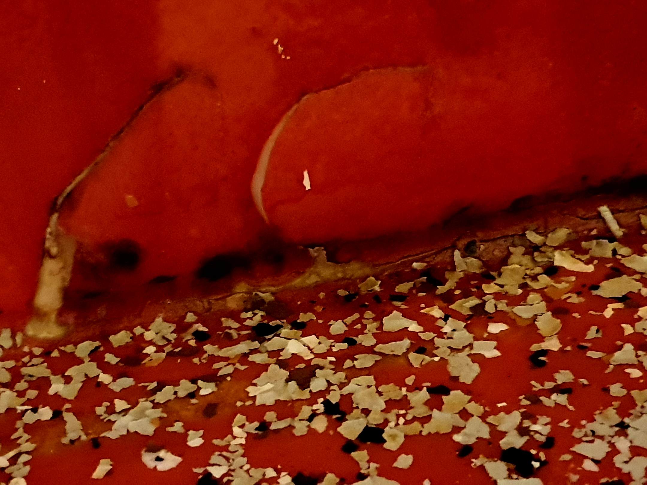 ZimmerBadezimmer im Zimmer 207. Fußboden und Teil der Fliesen wurden rot gestrichen, damit der rote und schwarze Schimmel nicht so auffällt.