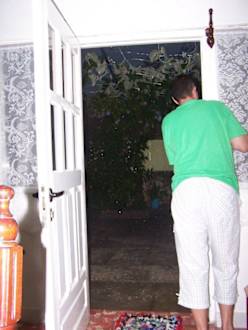 Výhled ze dveří na dvůr, jeden z mnoha rychlých prudkých dešťů