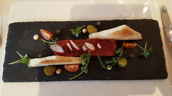Als erste Vorspeise Tatar vom Weideochsen mit Toast und Butter