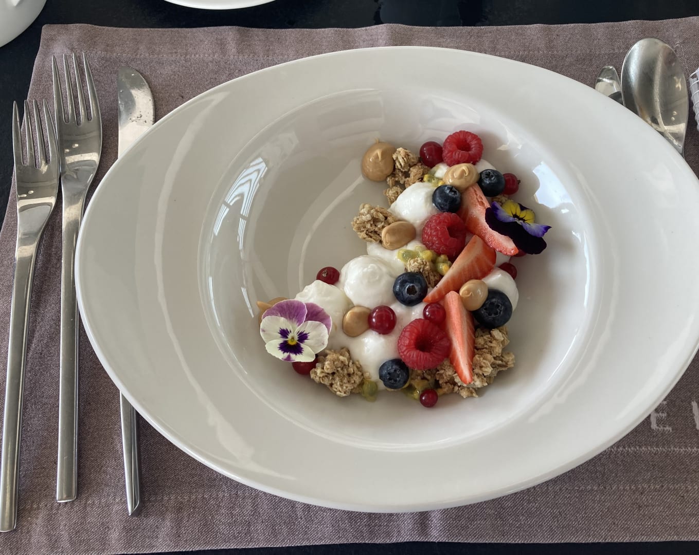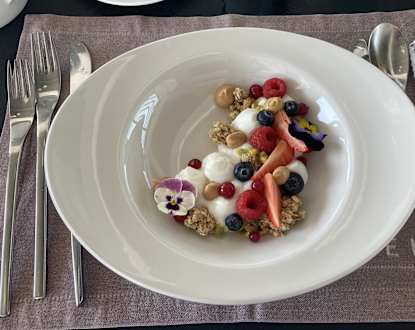 GastroDie Schale mit Beeren und Müsli im Frühstücksrestaurant auf Ebene 2 war herrlich angerichtet und zu schön, um sie zu essen.