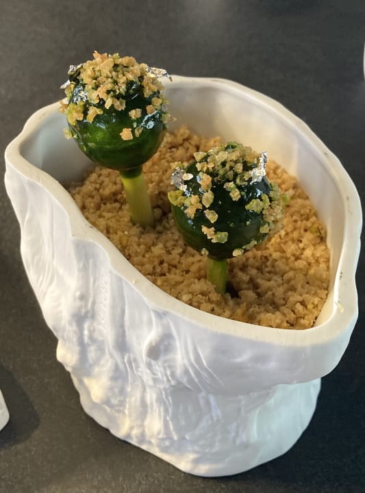 Dies war nur eine der Vorspeisen, die Teil des wunderbaren 5-Gänge- und 2-Dessert-Degustationsmenüs im Edesma waren. Es sieht aus wie ein Dessert, aber es ist Ziegenkäse.