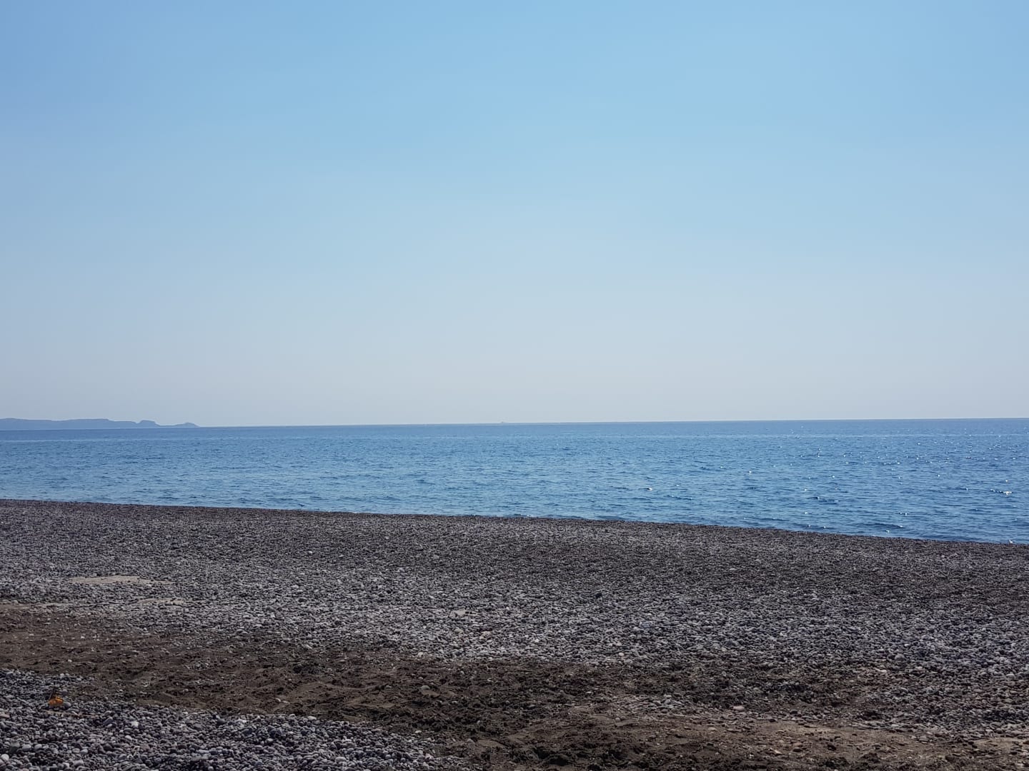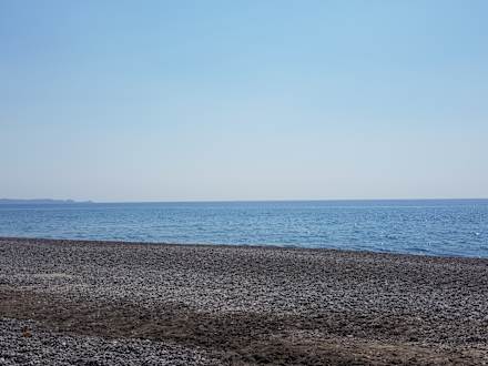 StrandAusblick von den sehr gemütlichen Liegen aufs Meer - Badeschuhe sind zu empfehlen wegen den Kieselsteinen
