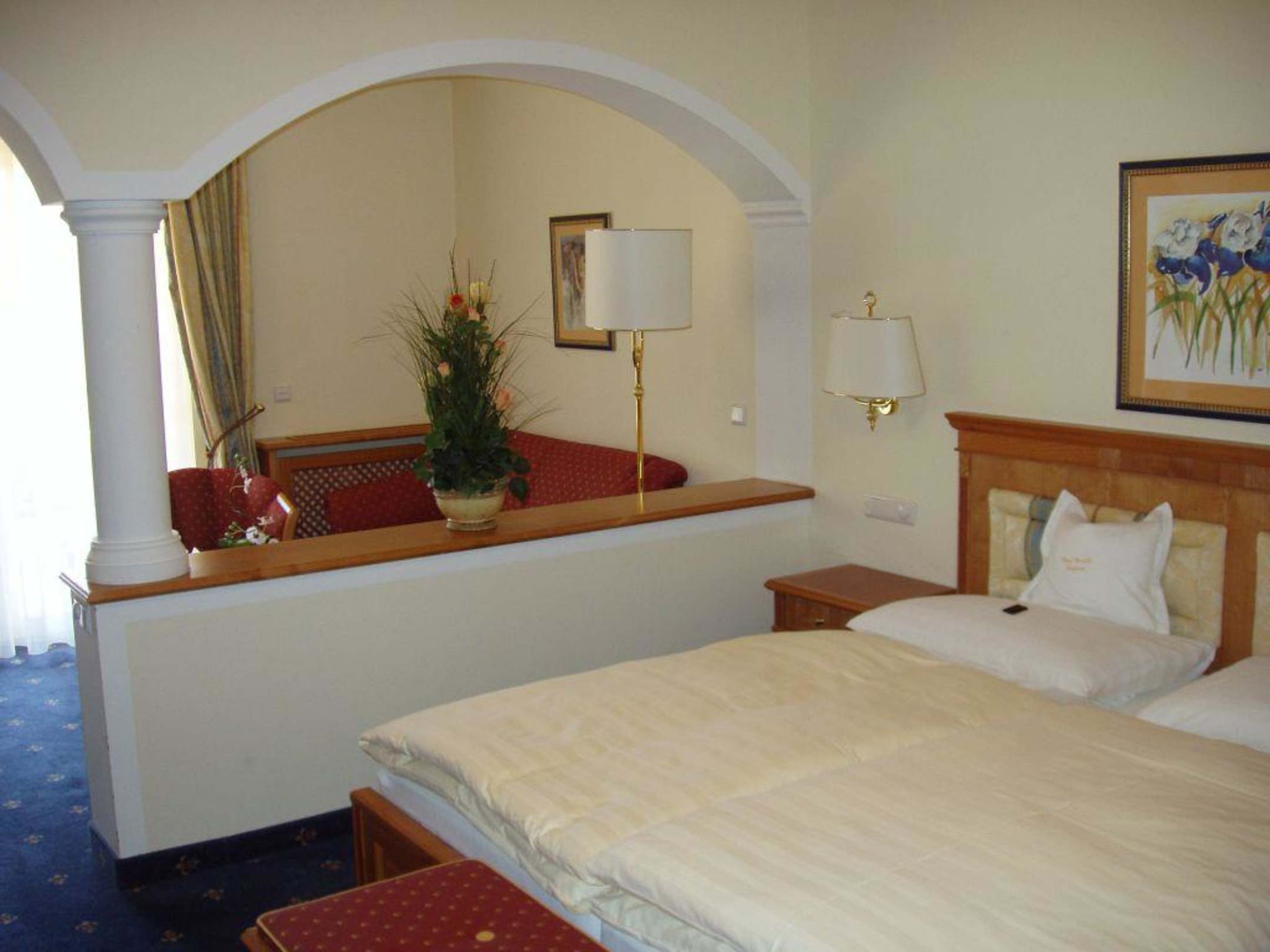 Zimmer Hotel GmachlSchlafzimmer + Wohnbereich hinter dem Raumteiler mit Säule. Großes Zimmer von 36 m2 "Leopoldskron" im Schlößl-Zubau des Hotels