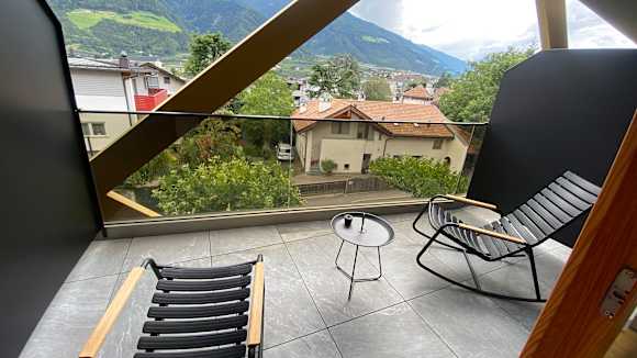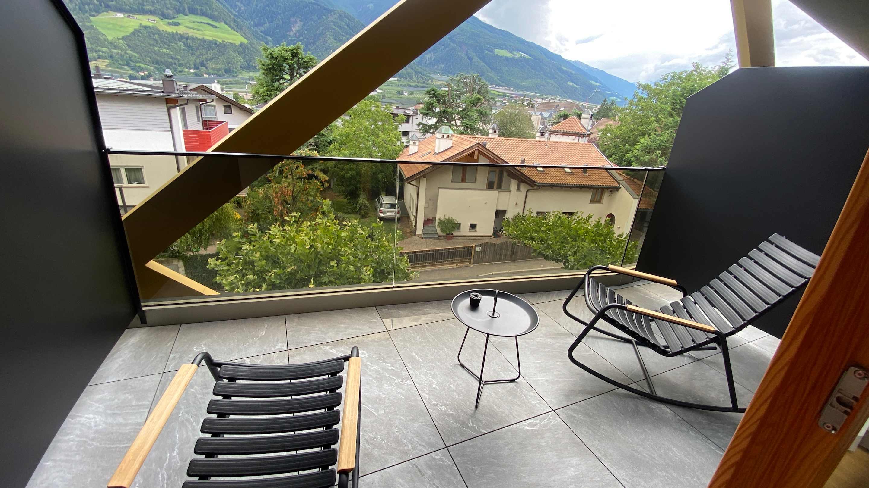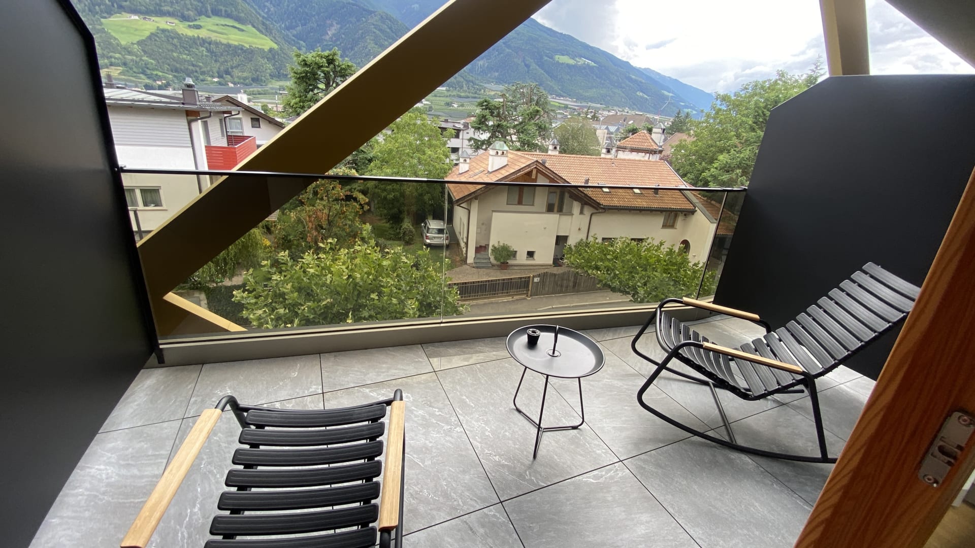 Balkon mit bequemen Schaukelstühlen
