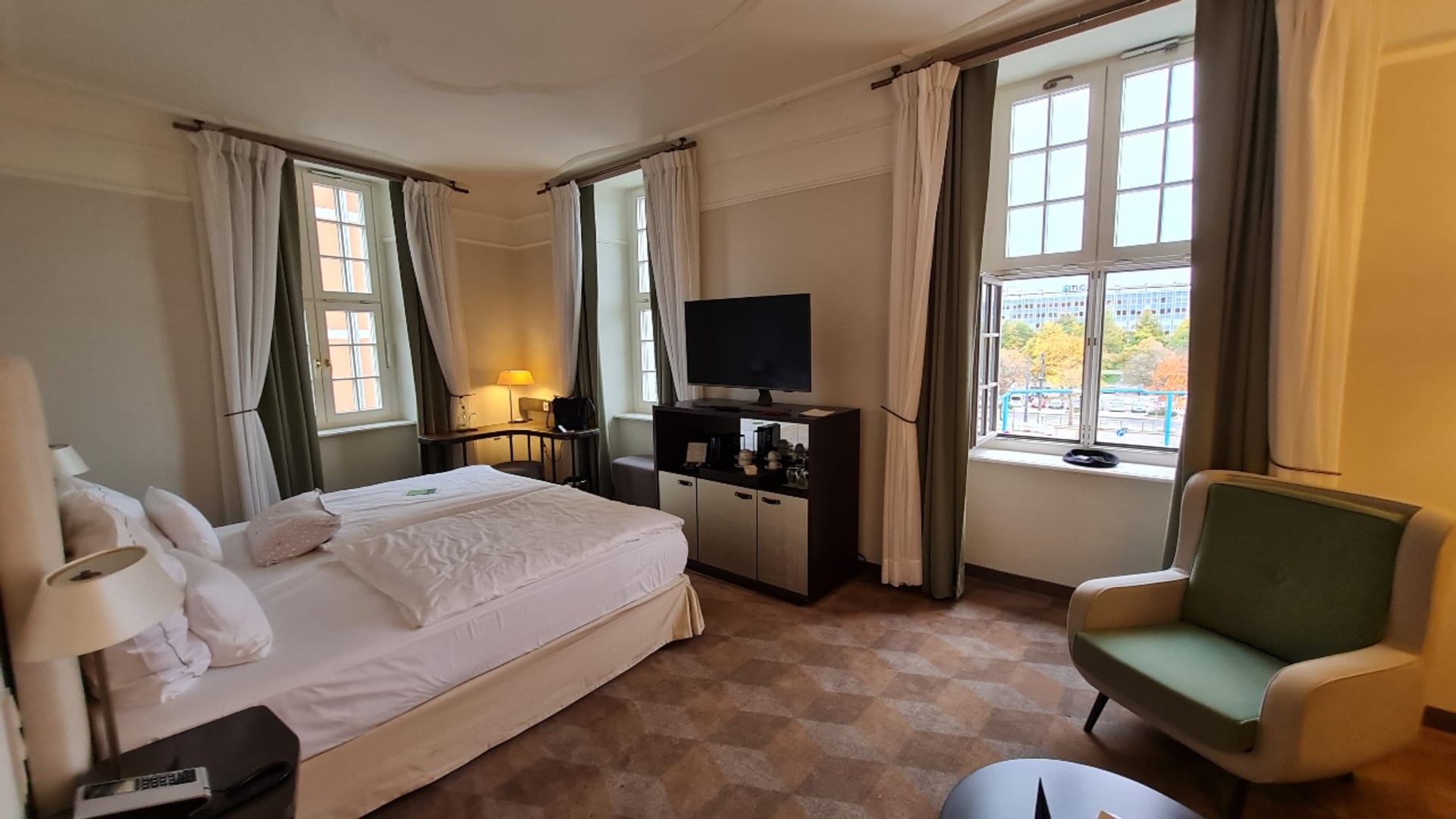 Schlafzimmer mit Sitzecke rechts und Schreibtisch links in der Ecke