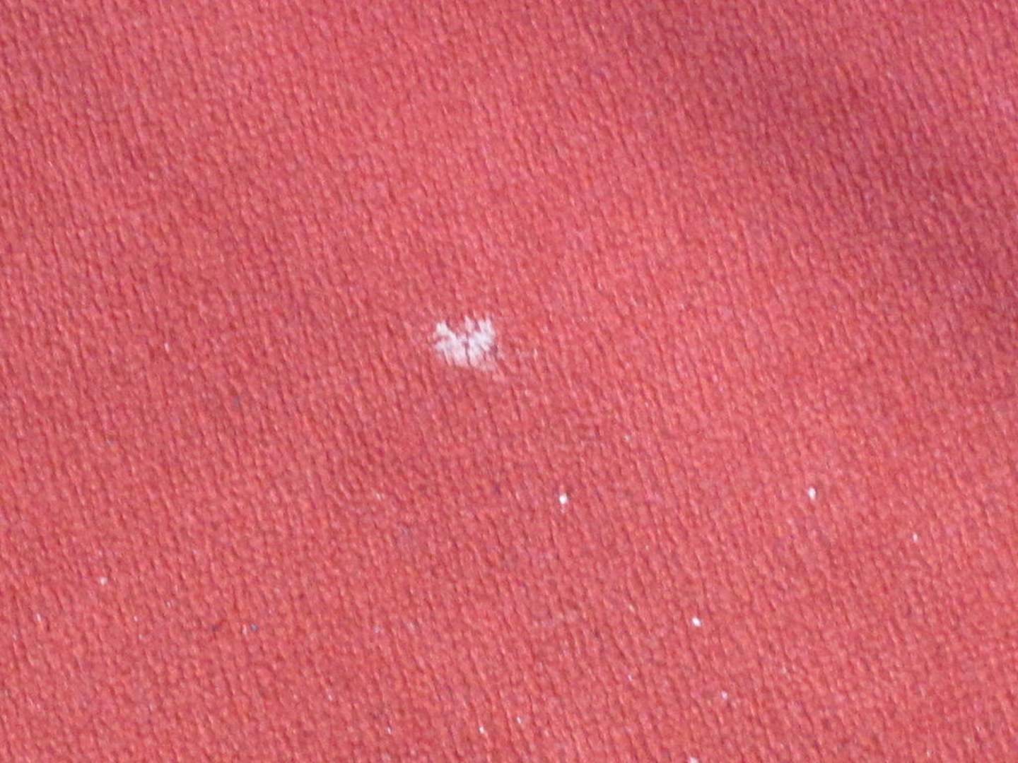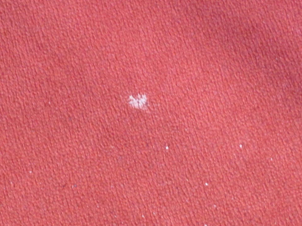 Rotes StoffsofaMehrere solcher diverser weißer Flecken befinden sich auf dem roten Stoffsofa und dem Sessel. Die Herkunft läasst sich nur erahnen.