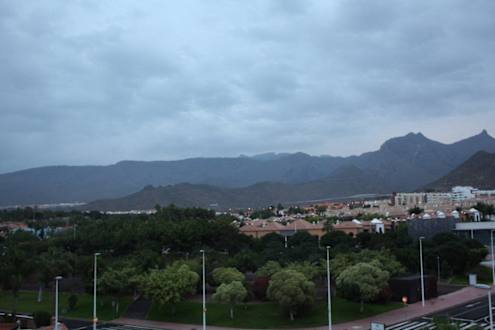 Blick auf die Berge vom FlurDer Weg zu den Zimmern im Hotel führt über einen offenen Flur mit diesem Ausblick.