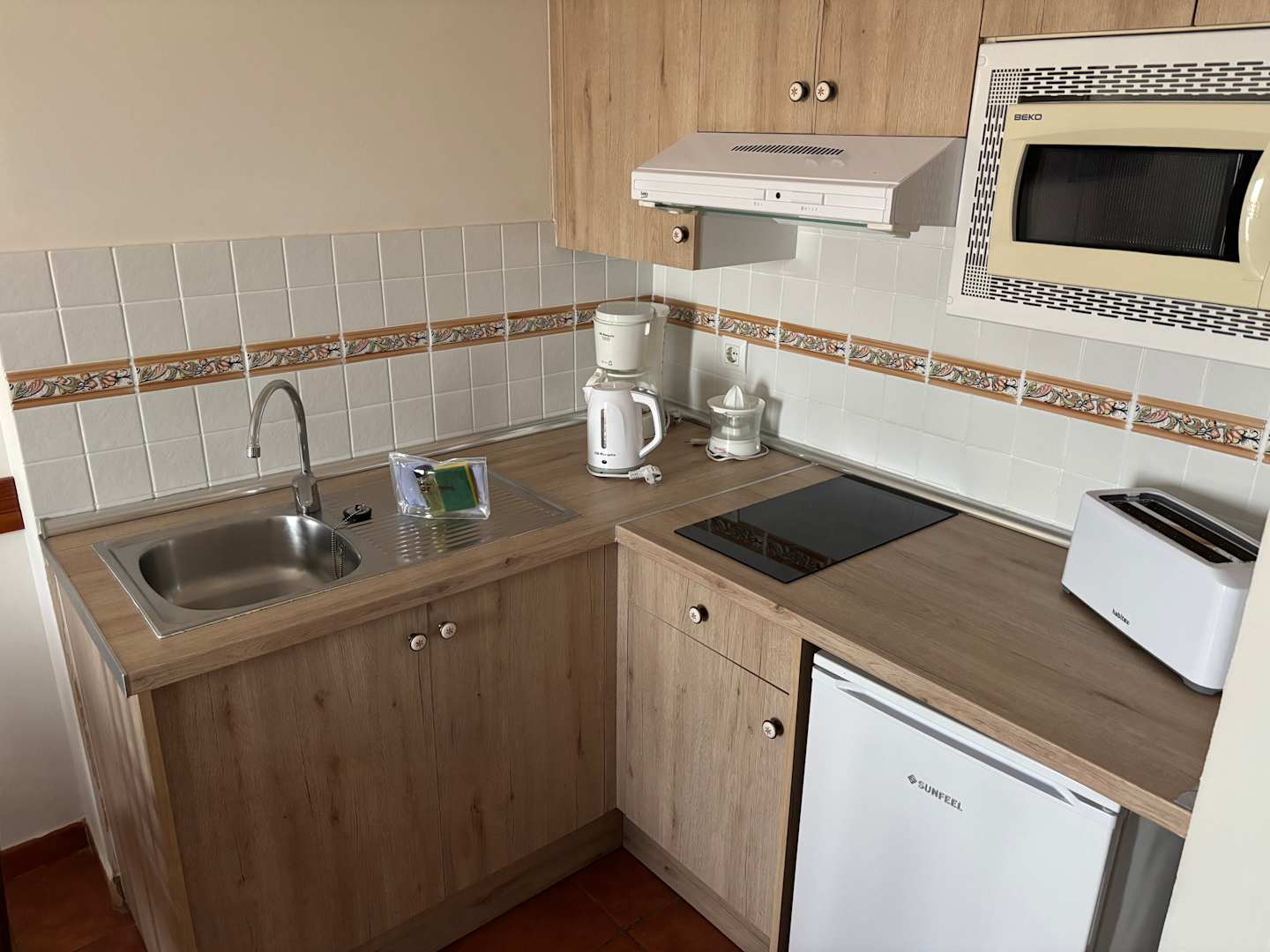 ZimmerGut ausgestatte Küchenecke. Man bekommt einen kleinen Beutel mit Waschmittel, Schwamm und Putztuch - topp!