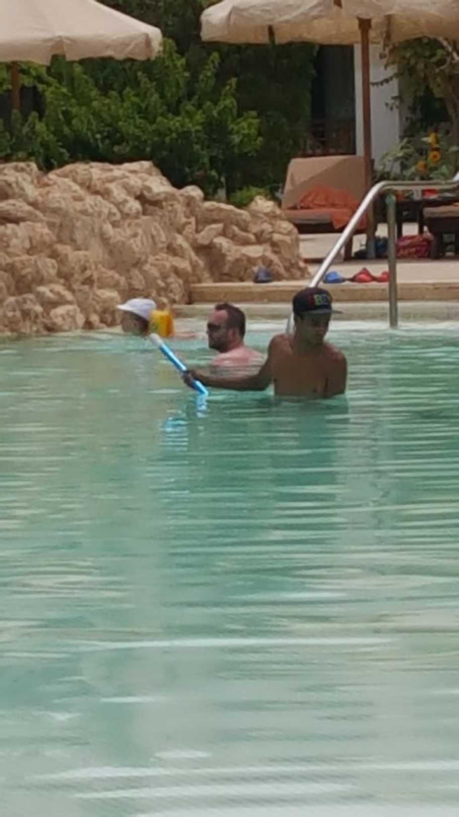 Poolreinigung wärend des Badebetriebs mit Algenbekämpfung pulver wurde ins Becken gestreut