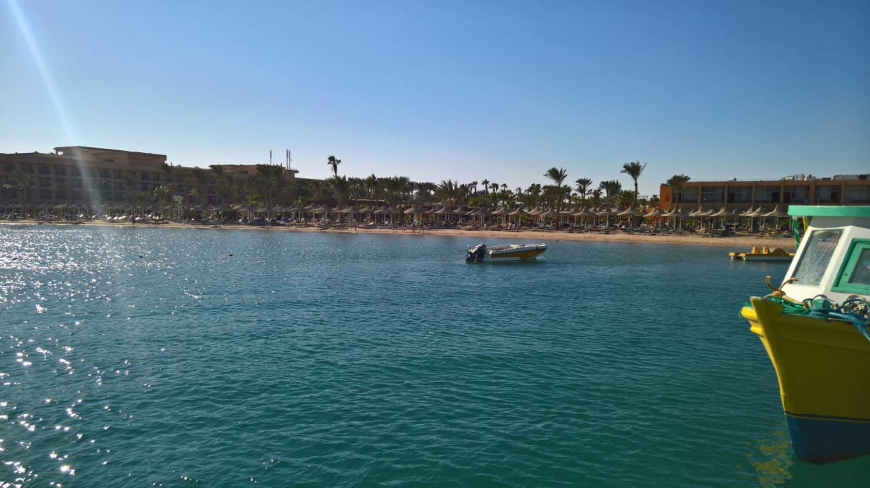 StrandBlick vom Steg zur grünen Hotelanlage und dem tollen Sandstrand, es sind keine Badeschuhe nötig!