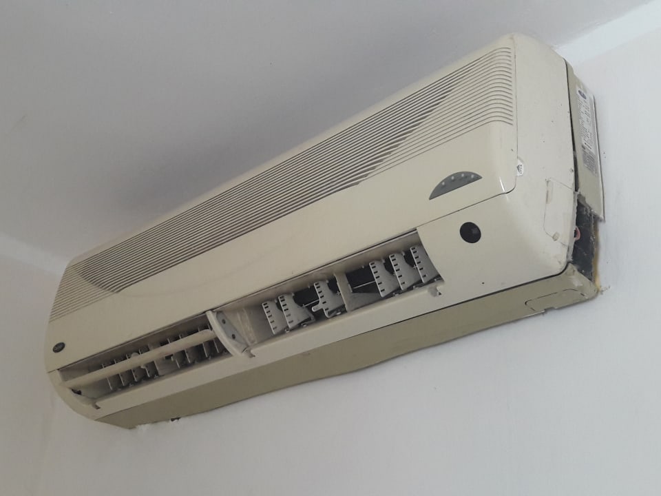 B12: Die Klimaanlage ist total verdreckt und hängt direkt über dem zweiten Bett.