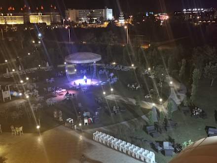 Blick in den Garten mit Bühne