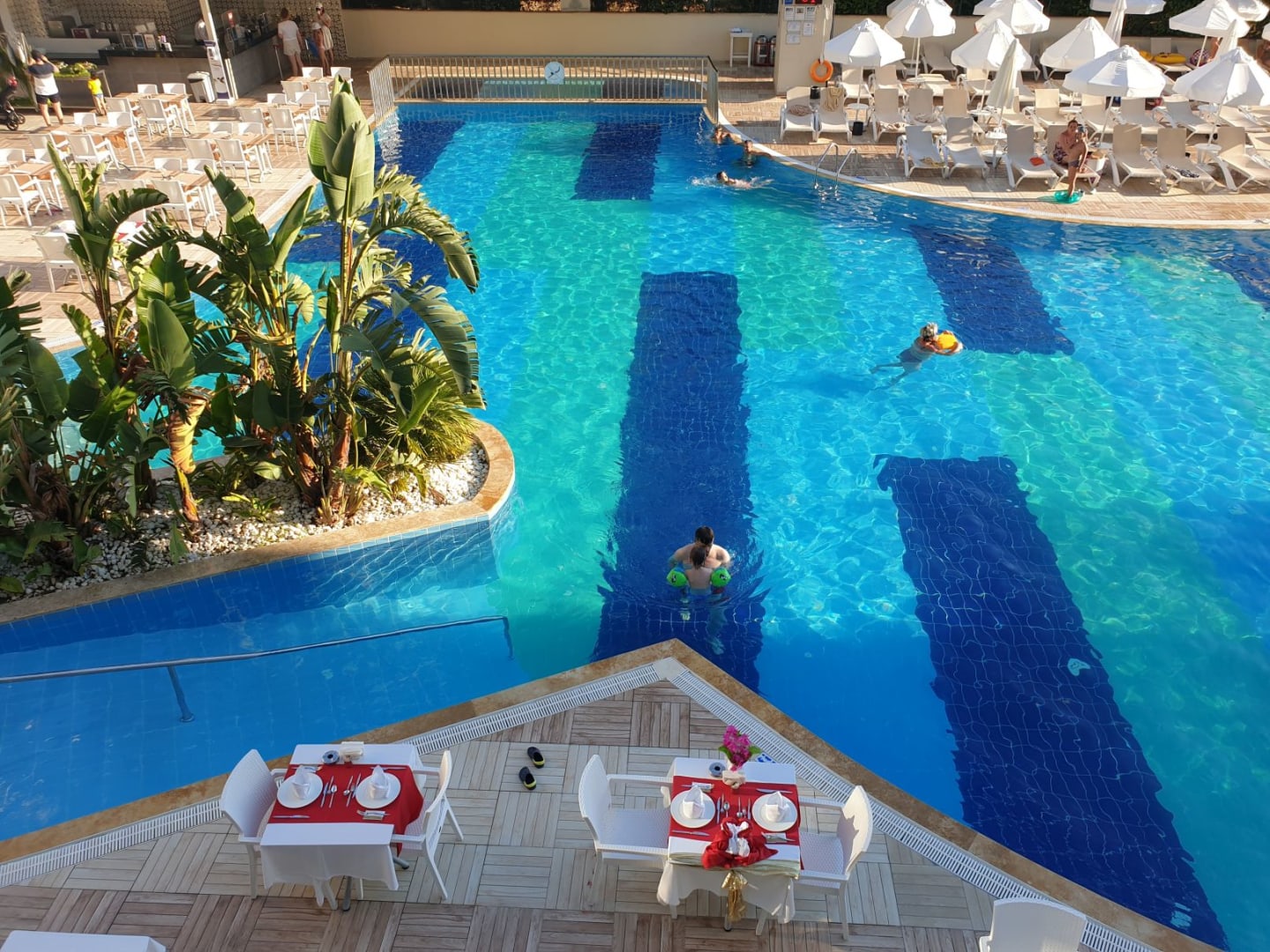 Eingedeckte Tische auf der Terasse (vor Eröffnung des Abendbuffets)