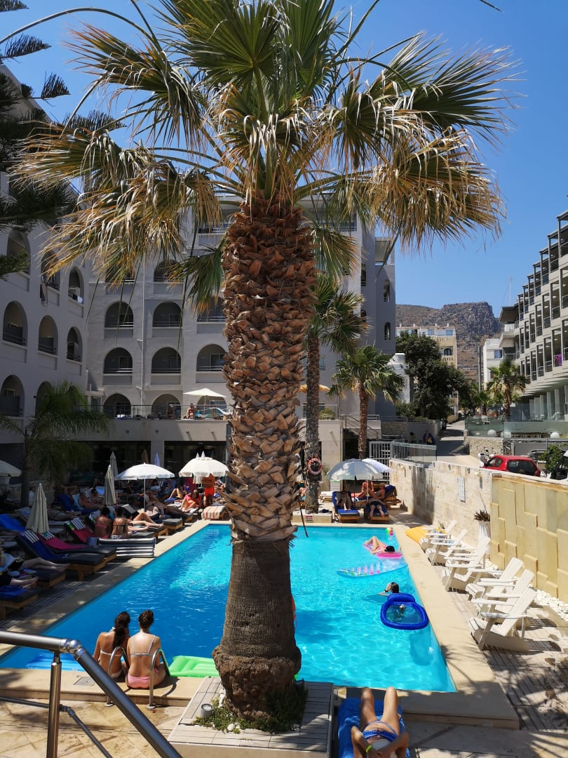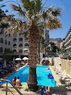 Aussicht von den Liegen oben Richtung Pool, Richtung Hotel