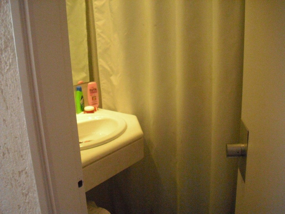 Hinter dem Vorhang die Dusche. Hinter der Tür das WC.