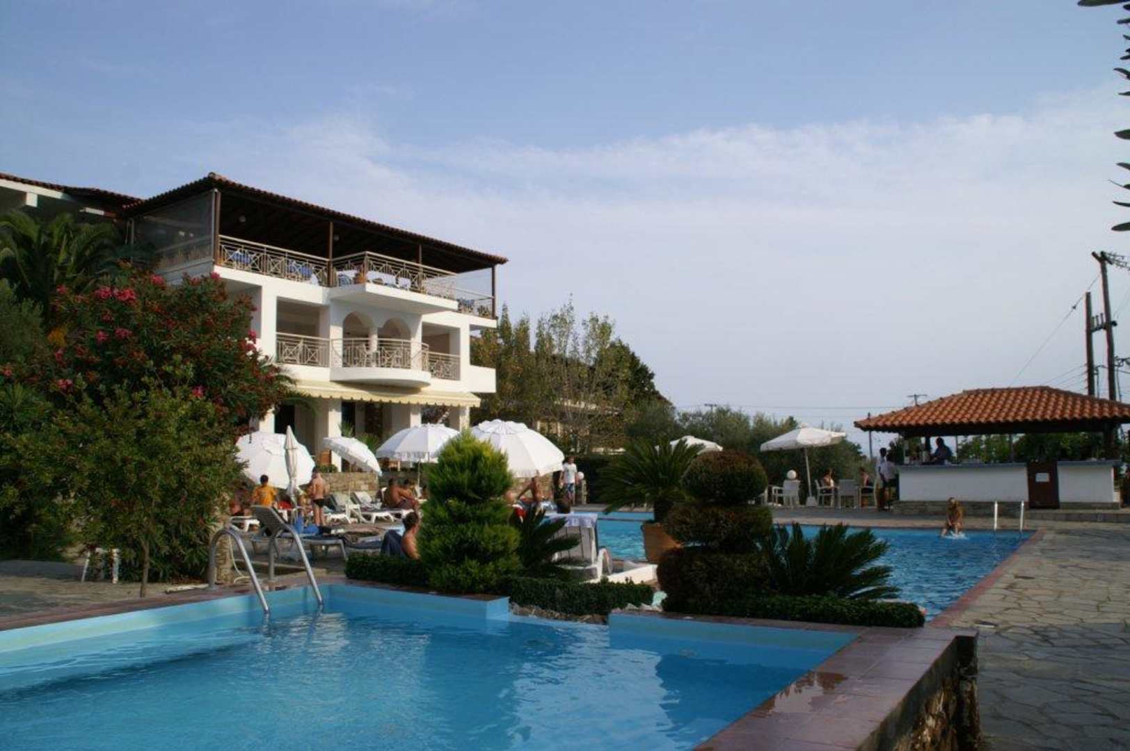 im vordergrund der große Whirlpool,dahinter der Hauptpool und der Kinderpool,links das Hauptgebäuder mit dem Restaurant und rechts die Poolbar