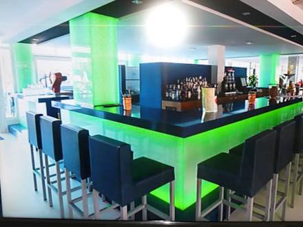 Grell, aber nicht zu kühlder Bartresen in neonfarbenem Licht