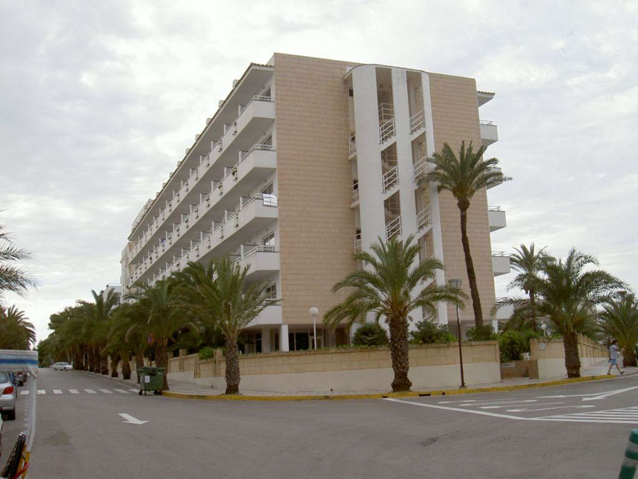 Das Bild zeigt das Hotel Janeiro auf Mallorca. Die Straße zur Linken führt zum Haupteingang und rechterhand führt der Weg zur hinteren Fläche des Hotels.