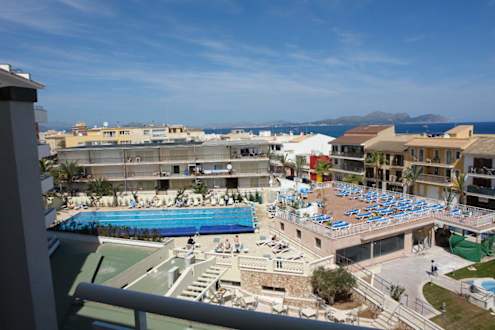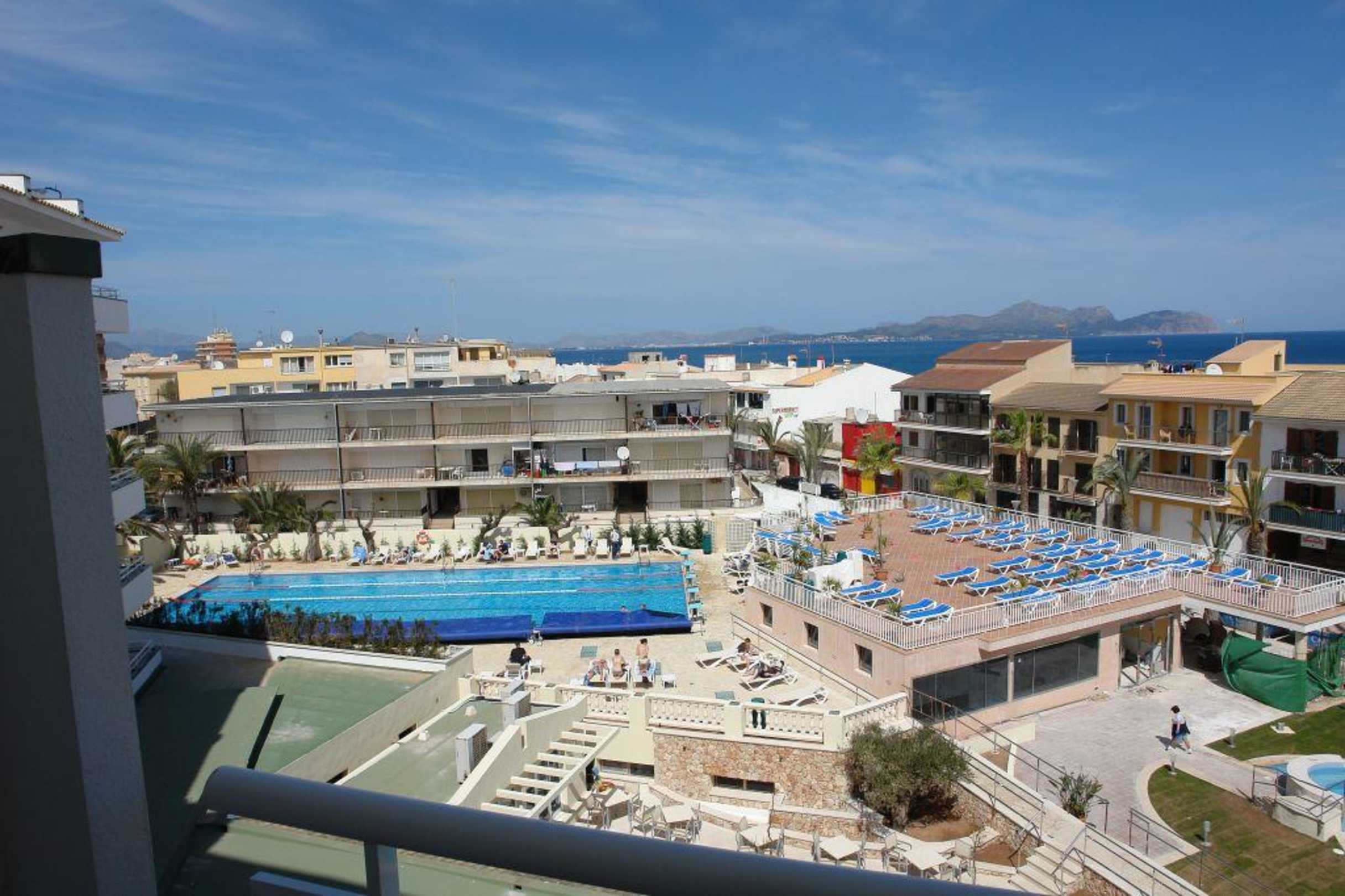 Blick vom Balkon auf den SportpoolIm Hintergrund die Bucht von Alcudia.