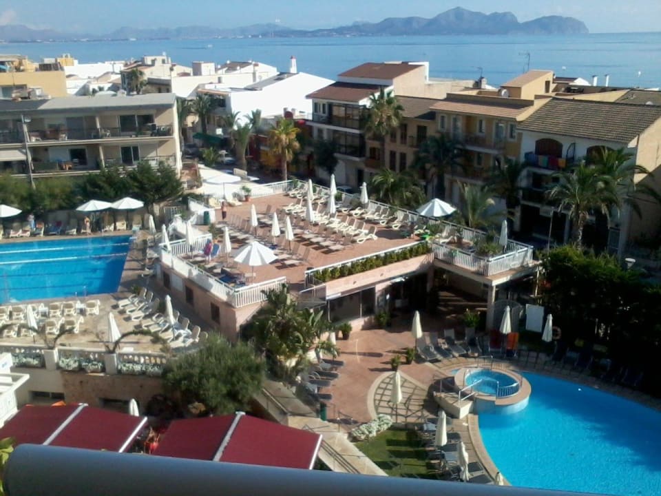 Ausblick von Zimmer 527Aufnahme vom Balkon auf die Hotelanlage. Unter der roten Markise befindet sich der Speisesaal.