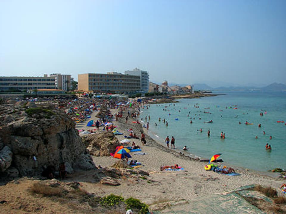 Im Hintergrund erkennt man das Hotel Janeiro zwischen den beiden anderen Hotels. Davor der ca. 150m breite und wunderschöne Sandstrand von Son Bauló.