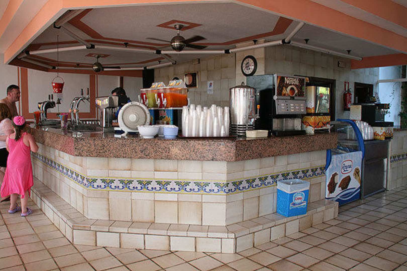 Hier stehen die in den Bewertungen hochgelobten und gut gelaunten Kellner und geben Bier und Drinks in Plastikbecher gut gelaunt nonstop aus trotz Schlangen anstehen. Auf dem Foto mal ausnahmsweise leer da Mittag alle am Strand oder Pool liegen.