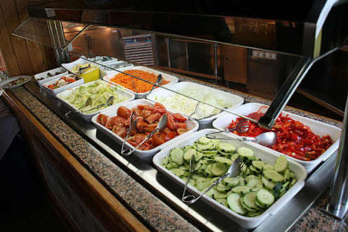 War eigentlich recht gut. Frische Pommes alle paar Minuten. Dazu Hackbraten und Hamburger Brötchen oder Hotdog Brötchen mit kleinen Würstchen sowie eine Auswahl an Gemüse um einen Salat oder Burger Belag zusammenstellen zu können.