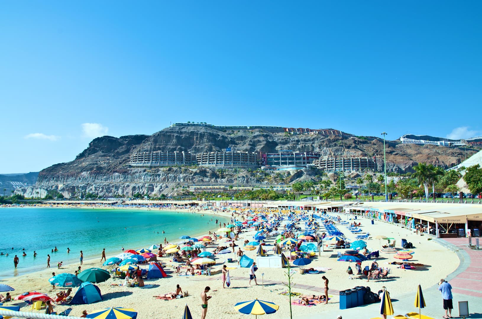Blick vom Ende des Strandes auf das Hotel