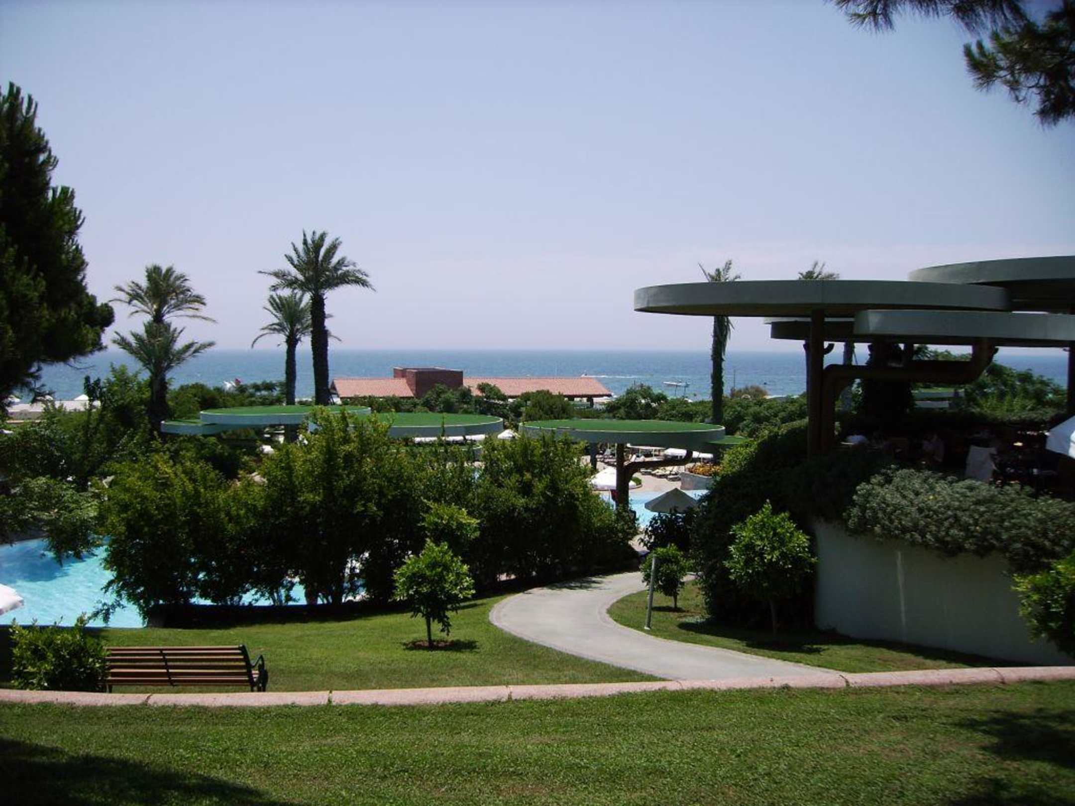 Blick von einer anhöhe zwischen Hotel und Pool mit direktem Blick aufs Meer!
