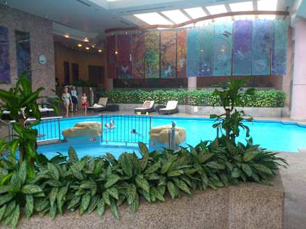 Blick auf den SpabereichSchwimmbecken und dahinter das Solebecken mit Weg nach Draussen. Sauna, Hamam und Kosmetikbehandlungen liegen dahinter