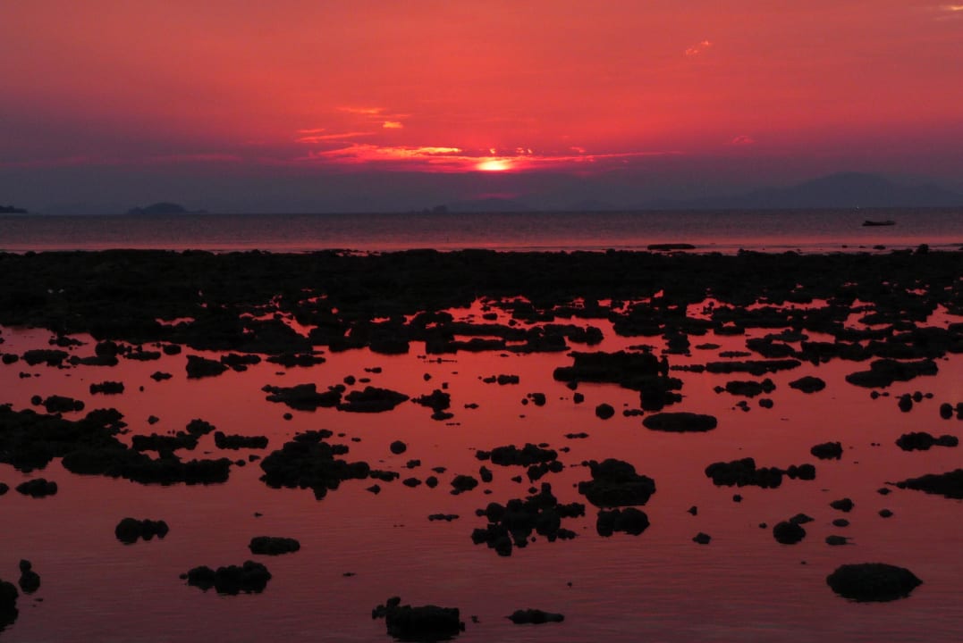 Sonnenuntergang mit außergewöhnlichen FarbenDie knallrote Sonne färbt das Meer bei Ebbe in einen glutroten Teppich.