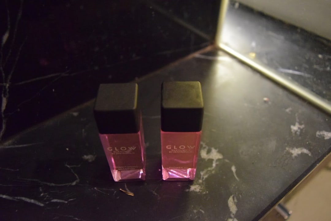 Glow-Shampoo und Duschgel. Drum herum leider ein verschmutztes Badezimmer...