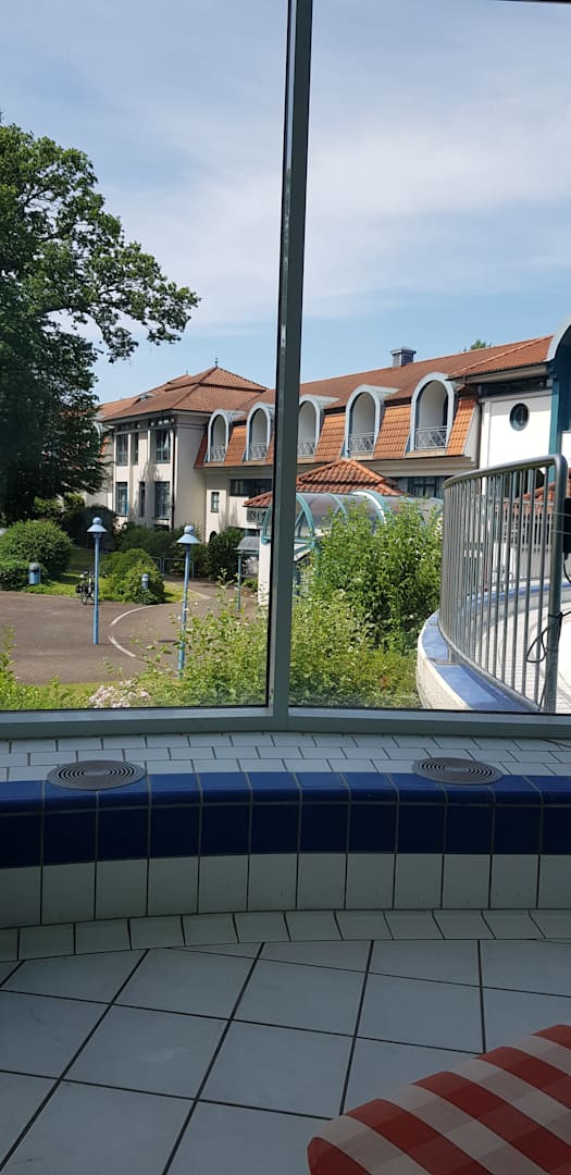 Blick vom Poolbereich zum Eingang Hotel/Wellnessbereich
