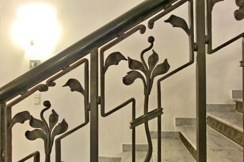 Teilansicht des eisernen Jugendstil-Geländers an einer der Hoteltreppen (April 2019)