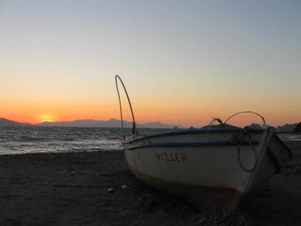 Sunset am Stranddie Sonne geht über griechischen Inseln unter, und 10 m hinter dir fährt der 40 Tonner vorbei