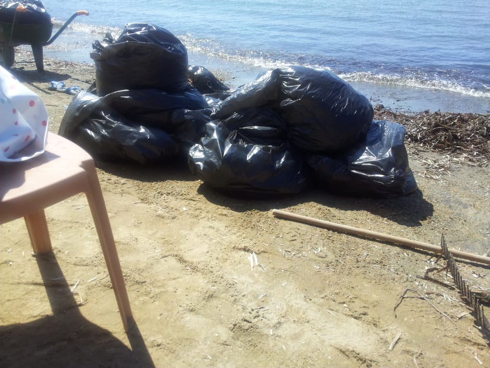 Seegras wird den ganzen Tag in Müllsäcke verpackt