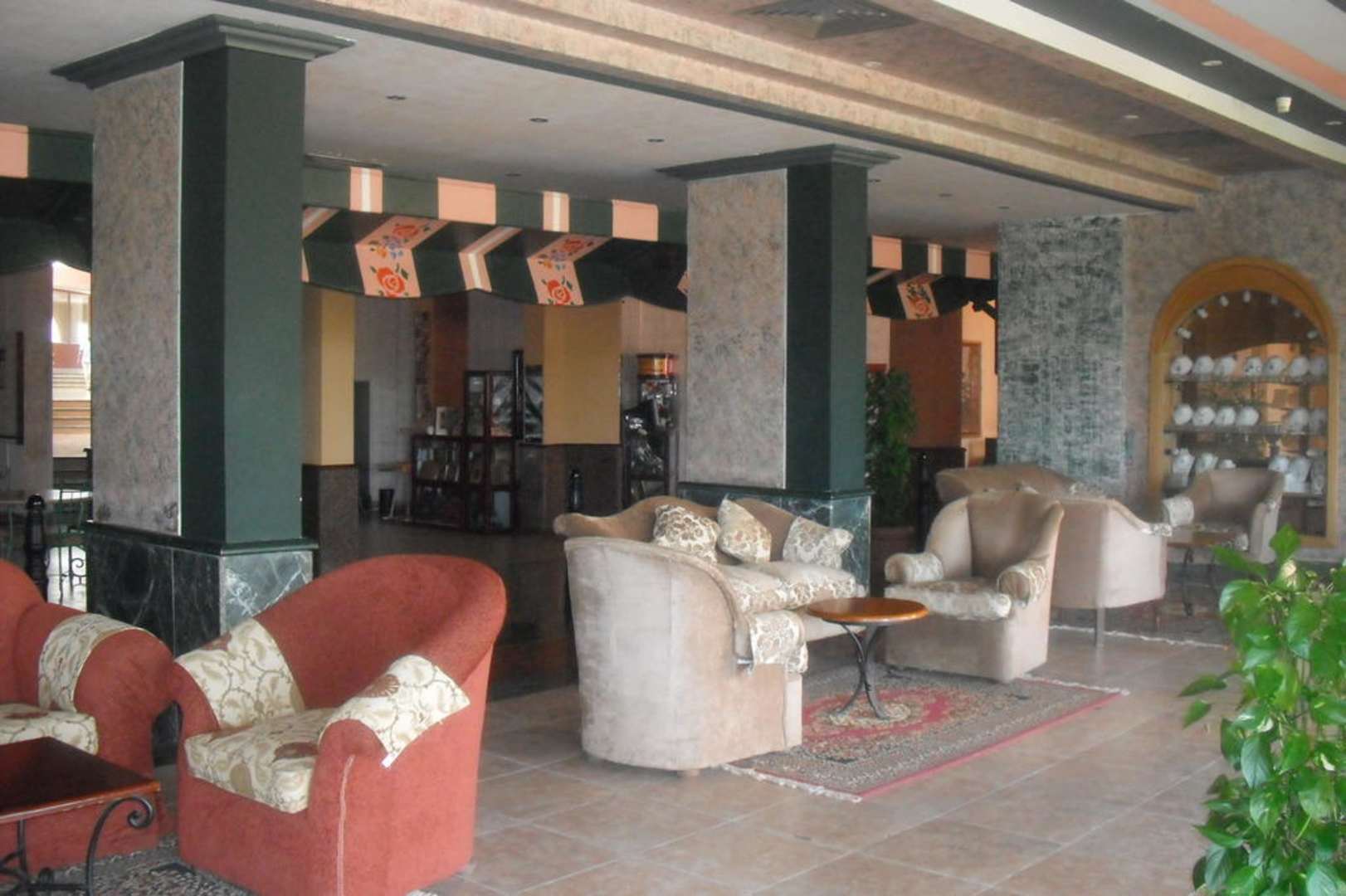In der Lobby stehen ganz viele Sofas und Sessel für gemütliches Sitzen zur Verfügung. Getränke werden zeitweise an den Tisch gebracht.