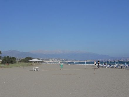 Sandstrand mit Beachvolleyball-Feld. Blick Richtung Rethymnon
