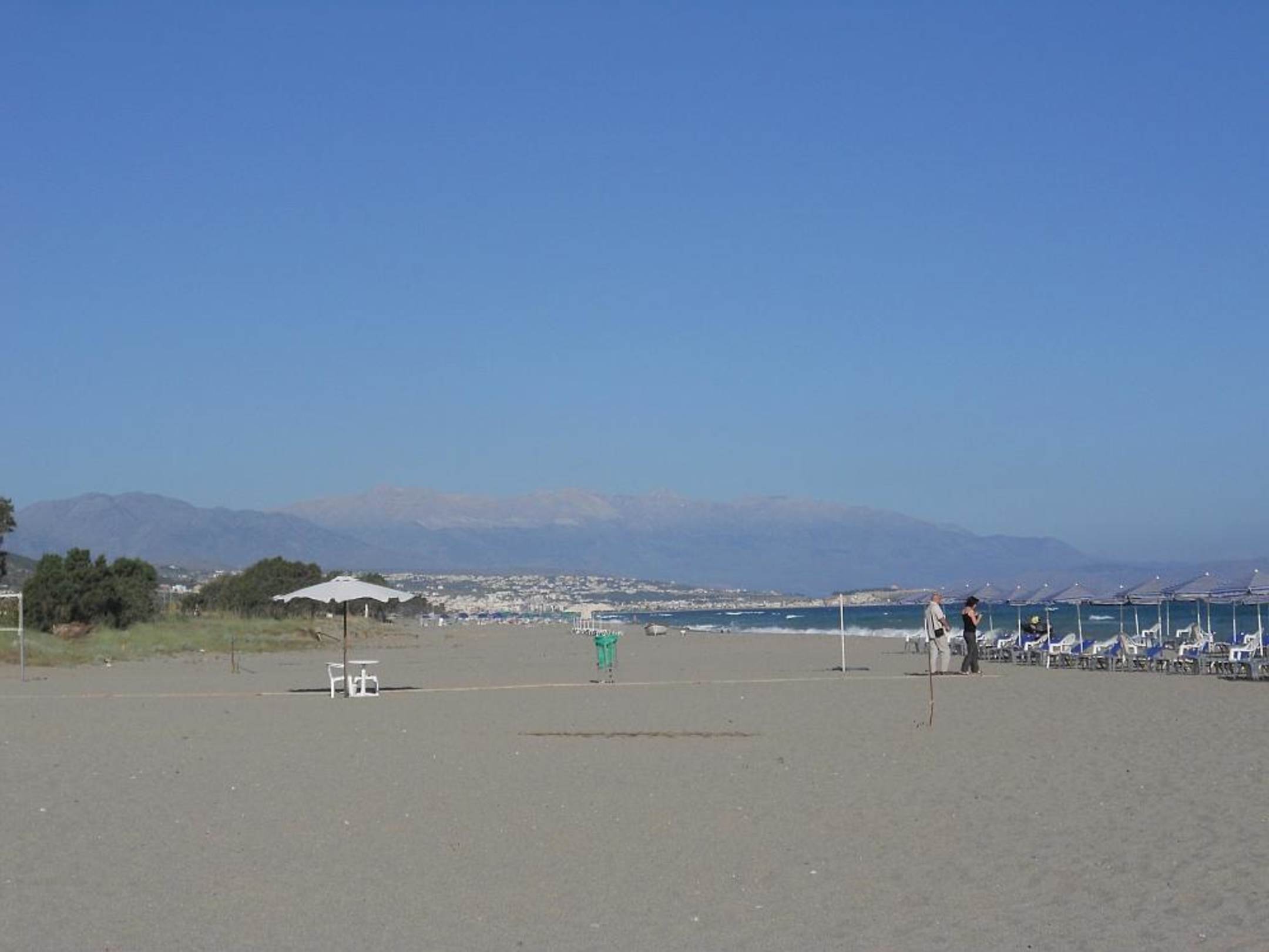 Sandstrand mit Beachvolleyball-Feld. Blick Richtung Rethymnon