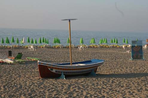 Breiter, großzügiger kilometerlanger Sandstrand/ Kies am Wasser.