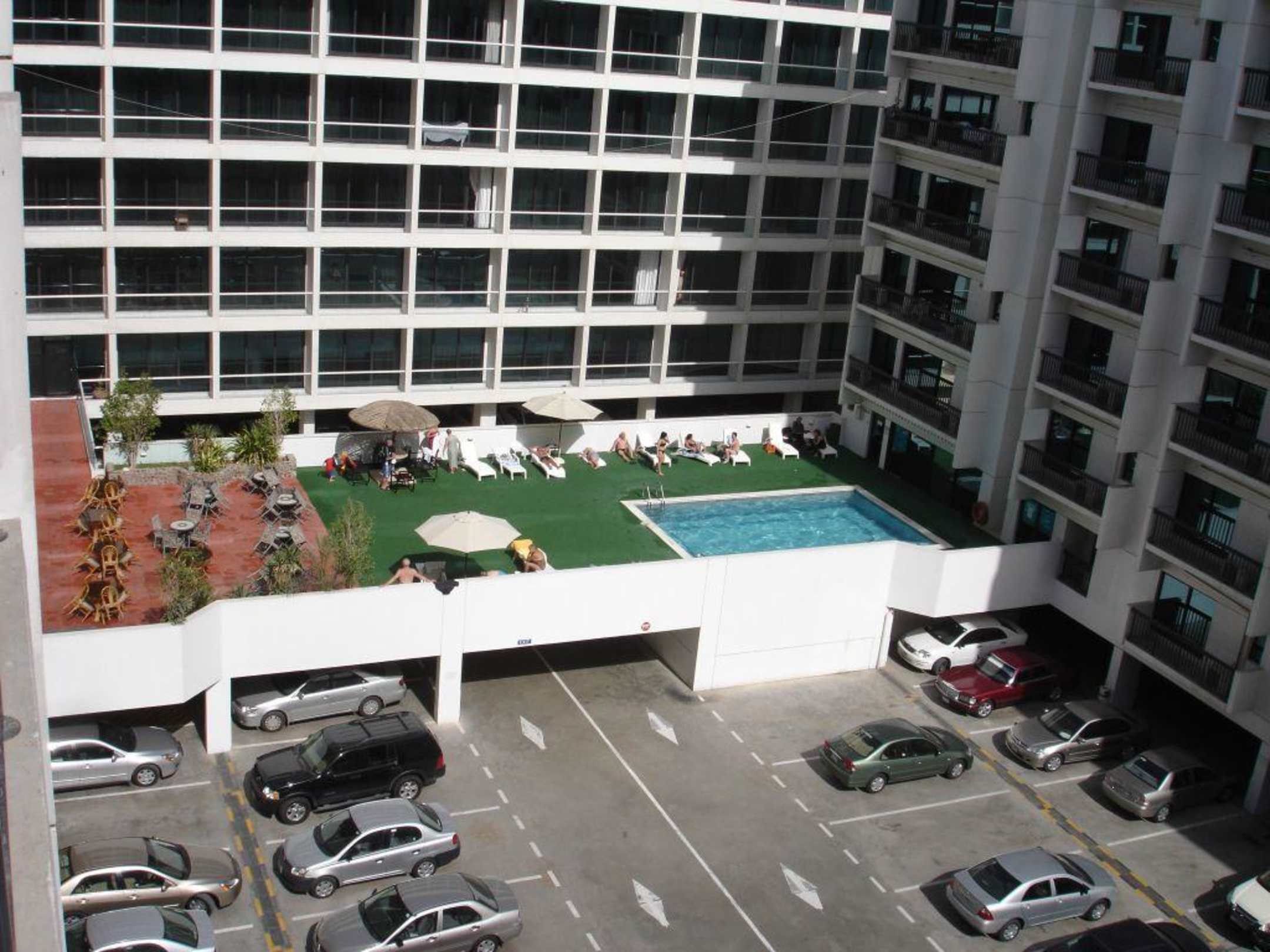 Golden Sands 3Pool und Liegenbereich sowie die Terrasse des Restaurants (linke Bildhälfte) im 1. OG des GoldenSands 3. Im Hintergrund das Golden Sands 5, im Vordergrund die Parkplätze, die von den Hotelgästen mitbenutzt werden können. Neckermann-Reisende können täglich umsonst in den "Hilton Beach Club" inkl. Transfer.