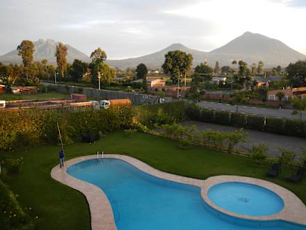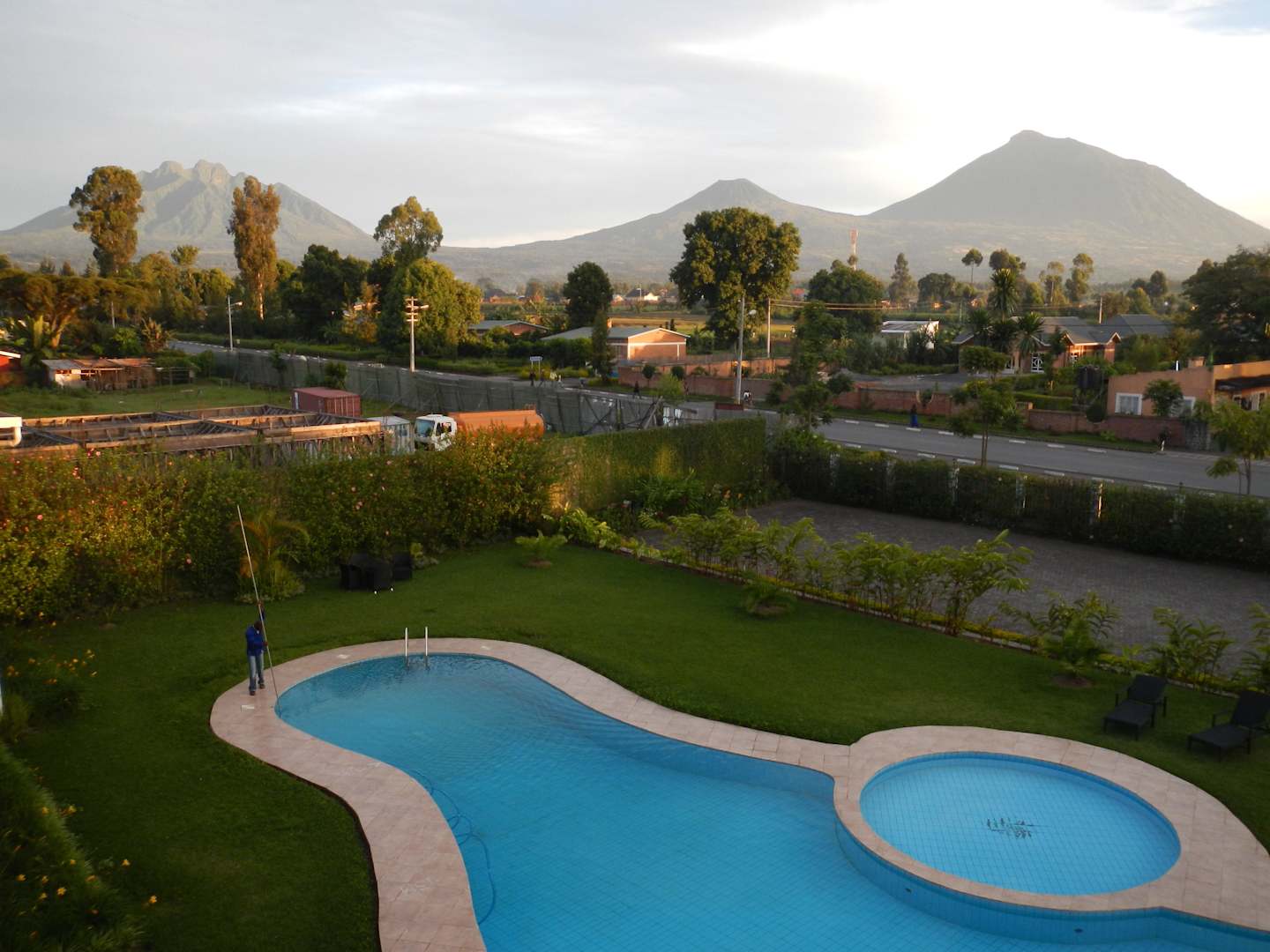 Pool und Virungaberge vom Zimmer(Terrasse)