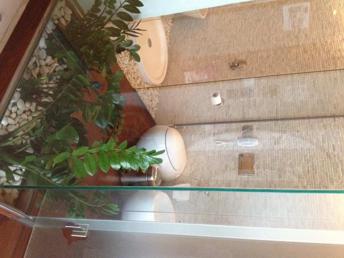 Das Bad hinter Glas vom Zimmer aus gesehen