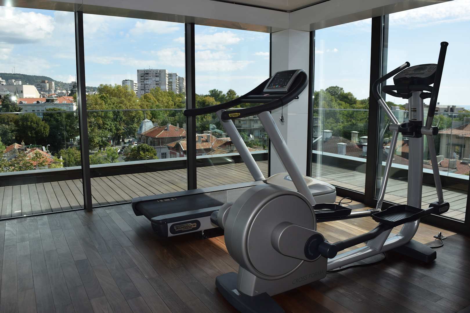 Fitness-Raum mit neuen Geräten und tollem Ausblick.Fitness-Raum mit neuen Geräten und tollem Ausblick.
