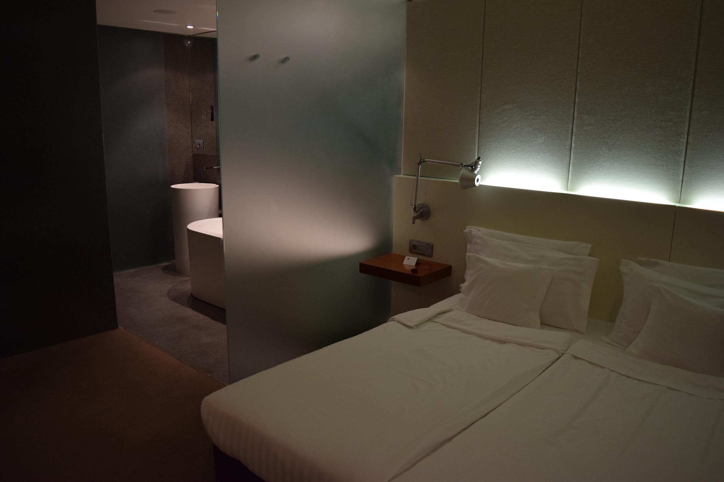 Blick vom Bett zum offenen Durchgang des BadezimmersBlick vom Bett zum offenen Durchgang des Badezimmers