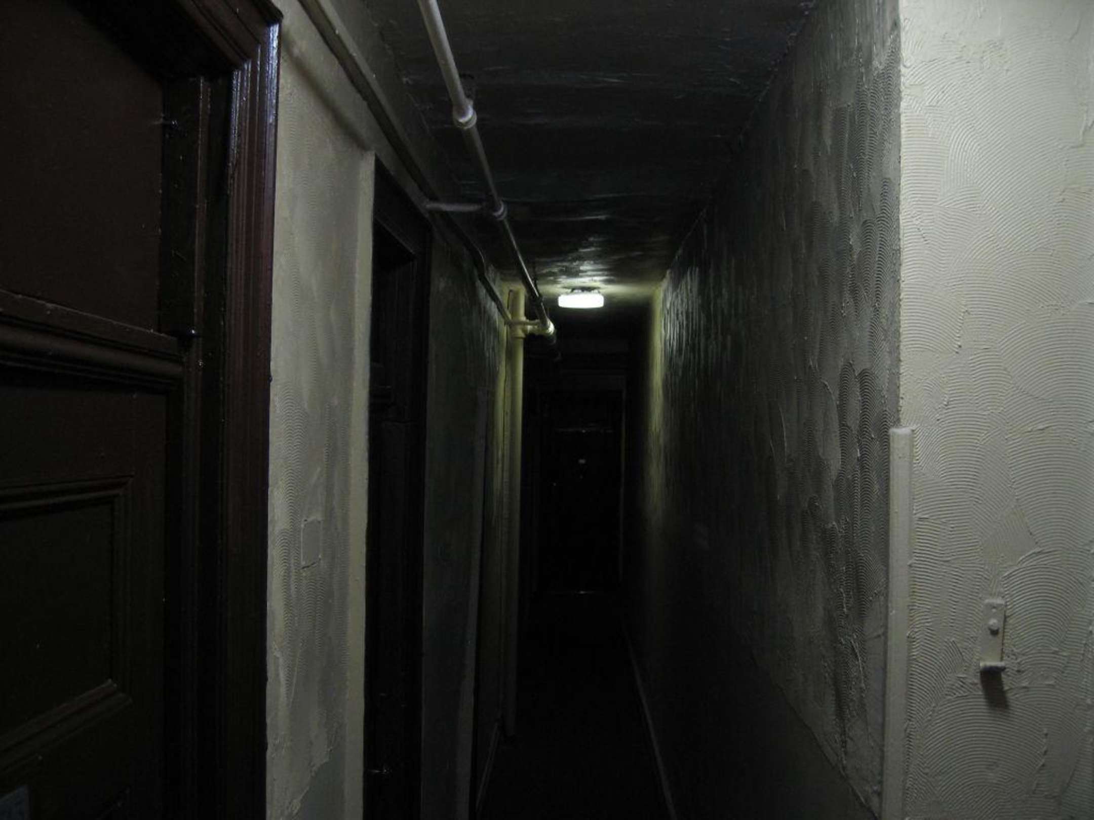 Blick auf der 3.Etage mit grob verspachtelter Wand und Ringneonlampe an der Decke