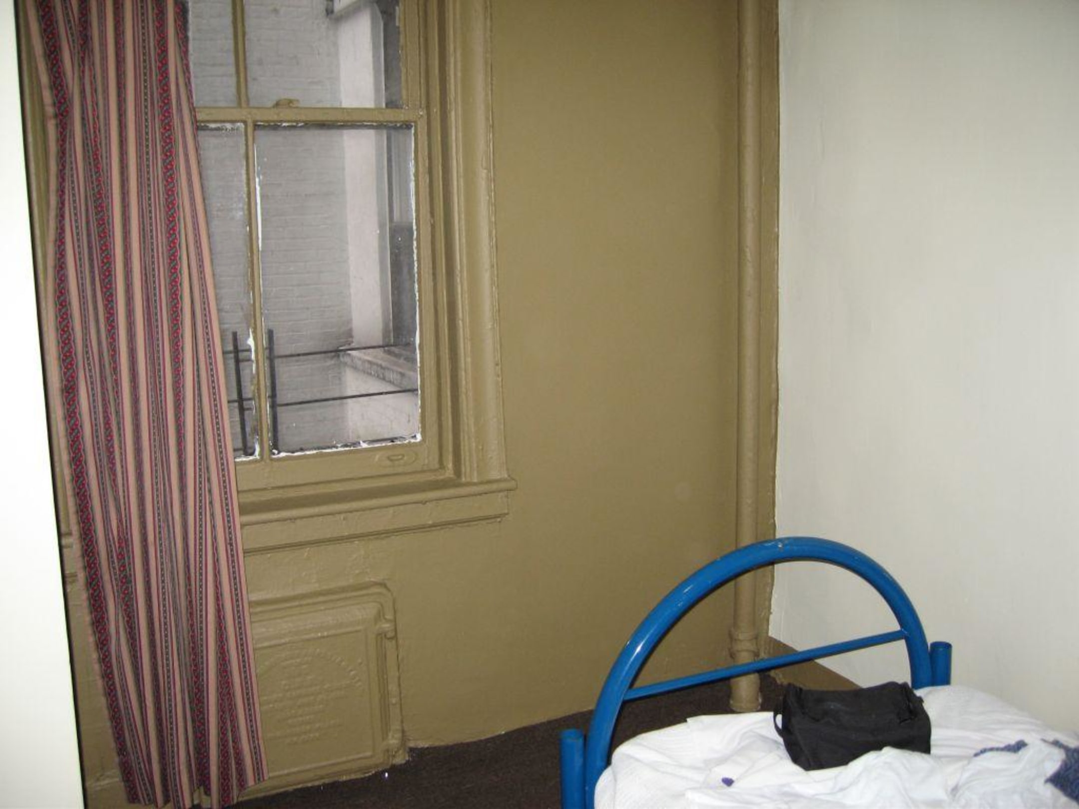 SinglezimmerCa.3x3 m groß mit undichtem Fenster und als "Heizung" ein heißes Wasserdampfrohr rechts vom Fenster.
